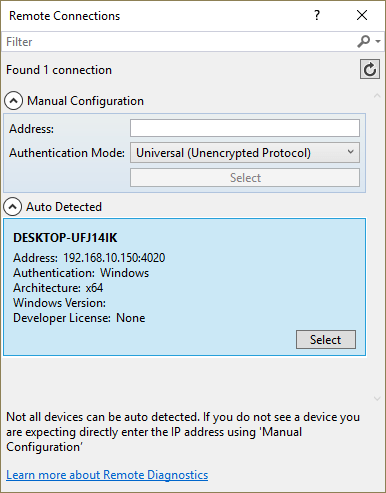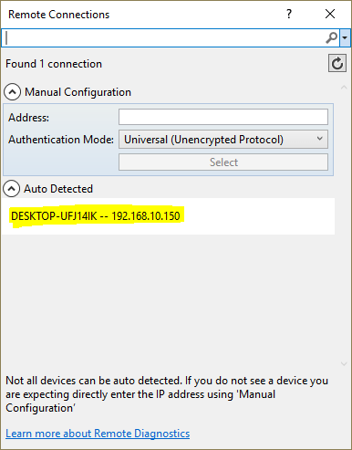 You may have to provide log in details that are the same as the user currently running on the remote PC. - Once your solution has compiled you should see confirmation of your connection on the remote PC.