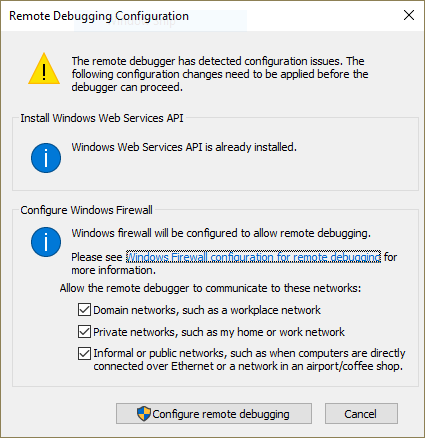 You may see a message regarding configuration issues, this is usually due to windows firewall. Click on the Configure remote debugging button to make the required changes.