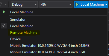 - Click the drop down next to Local Machine in your debug toolbar and select Remote Debugging: